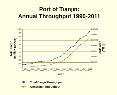 Production then increased in leaps and bounds. In 1988 throughput passed the 20 million tonnes milestone, and in the ten years from 1993, annual throughput growth averaged 10 million tonnes every year. In December 2001, the port was the first port in north China to reach the 100 million tonnes mark.[20] In 2004 it reached 200 million tonnes, in 2007 300 million tonnes and in 2010 400 million tonnes. The container handling capacity of the port increased from 0.4 million TEU in 1992, to 2.4 million TEU in 2002, 7.1 million TEU in 2007, and more than 10 million TEU in 2010.