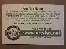 The Portland Arts Tax, formally the Arts Education and Access Income Tax, is a $35 tax paid by residents of Portland, Oregon to support school teachers and art focused nonprofit organizations. Residents age eighteen or older with $1,000 or more of taxable income are required to pay the tax.[1] The tax was instituted when Portland voters passed Oregon Ballot Measure 26-146 in November 2012.[2]
