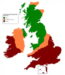 In Great Britain, glaciation affected Scotland but not southern England, and the post-glacial rebound of northern Great Britain (up to 10 cm per century) is causing a corresponding downward movement of the southern half of the island (up to 5 cm per century). This will eventually lead to an increased risk of floods in southern England and south-western Ireland.[11]