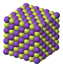 KF crystallizes in the cubic NaCl crystal structure. The lattice parameter at room temperature is 0.266 nm.[4]