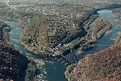 Legal issuesThis westward-looking aerial photograph shows the Shenandoah River (left) flowing into the Potomac River (right) at Harpers Ferry, WV. The Potomac then continues eastward toward the Chesapeake Bay. (Visible in the foreground are the ruins of the famed B&O Bridge which was destroyed nine times during the Civil War -- four times by military action and five times by floods.) Boundary between Maryland, Virginia, and West Virginia at Harpers Ferry Satellite view of the Potomac River passing through two water gaps downstream of Harpers Ferry For 400 years Maryland and Virginia have disputed control of the Potomac and its North Branch, since both states' original colonial charters grant the entire river rather than half of it as is normally the case with boundary rivers. In its first state constitution adopted in 1776, Virginia ceded its claim to the entire river but reserved free use of it, an act disputed by Maryland. Both states acceded to the 1765 Mount Vernon Compact and the 1877 Black-Jenkins Award which granted Maryland the river bank-to-bank from the low water mark on the Virginia side, while permitting Virginia full riparian rights short of obstructing navigation. From 1957 to 1996, the Maryland Department of the Environment (MDE) routinely issued permits applied for by Virginia entities concerning use of the Potomac. However, in 1996 the MDE denied a permit submitted by the Fairfax County Water Authority to build a water intake 725 feet (220 m) offshore, citing potential harm to Maryland's interests by an increase in Virginia sprawl caused by the project. After years of failed appeals within the Maryland government's appeal processes, in 2000 Virginia took the case to the Supreme Court of the United States, which exercises original jurisdiction in cases between two states. Maryland claimed Virginia lost its riparian rights by acquiescing to MDE's permit process for 63 years (MDE began its permit process in 1933). A Special Master appointed by the Supreme Court to investigate recommended the case be settled in favor of Virginia, citing the language in the 1785 Compact and the 1877 Award. On December 9, 2003, the Court agreed in a 7–2 decision.[42] ![]() Map of land use in the watershed The original charters are silent as to which branch from the upper Potomac serves as the boundary, but this was settled by the 1785 Compact. When West Virginia seceded from Virginia in 1863, the question of West Virginia's succession in title to the lands between the branches of the river was raised, as well as title to the river itself. Claims by Maryland to West Virginia land north of the South Branch (all of Mineral and Grant Counties and parts of Hampshire, Hardy, Tucker and Pendleton Counties) and by West Virginia to the Potomac's high-water mark were rejected by the Supreme Court in two separate decisions in 1910.[43][44] Flora of the Potomac River Basin