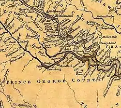 ![]() Powel's Creek shown on the Fry-Jefferson map (1752) between Jordan's Point and the Maycox plantation. | |