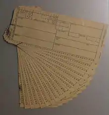 Powers-Samas used a variety of card sizes and formats, including 21, 36, 40, 45, 65 and 130 column cards.[6] The 40-column card, measuring 4.35 by 2 inches, was the most common.[5][7]