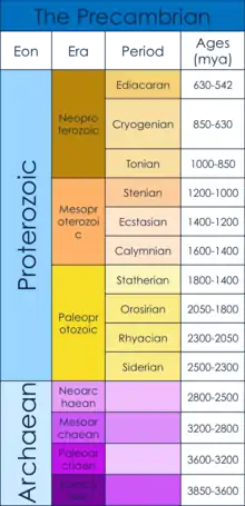 The Precambrian era dates from the beginning of Earth's formation (4.6 billion years ago) to the beginning of the Cambrian Period, 542 million years ago.[1] The Precambrian consists of the Hadean, Archaean and Proterozoic eons.[1] Specifically, this article examines the Ediacaran, when the first multicellular bodies are believed to have arisen, as well as what caused the rise of multicellularity.[2] This time period arose after the Snowball Earth of the mid Neoproterozoic. The "Snowball Earth" was a period of worldwide glaciation, which is believed to have served as a population bottleneck for the subsequent evolution of multicellular organisms.[3]