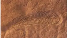 The Ediacaran fossils of Southern Australia contain trace fossils, which indicate that there were motile benthic organisms. The organisms that produced the traces in the sediments were all worm-like sediment feeders or detritus feeders (Detritivore). There are a few trace fossils, which resemble arthropod trails. Evidence suggests that arthropod-like organisms existed during the Precambrian. This evidence is in the type of trails left behind; specifically one specimen that shows six pairs of symmetrically placed impressions, which resemble trilobite walking trails.[6]