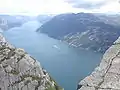 Preikestolen or Prekestolen (English: "The Pulpit Rock", "Pulpit", or "Preacher’s Chair") is a tourist attraction in the municipality of Strand in Rogaland county, Norway. Preikestolen is a steep cliff which rises 604 metres (1,982 ft) above Lysefjorden. Atop the cliff, there is an almost flat top of approximately 25 by 25 metres (82 ft × 82 ft). Preikestolen is located near the Western part of the fjord, and on its North side.