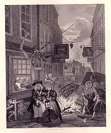 The drunk receiving the contents of a bucket is wearing a masonic master's jewel, and his servant's sword indicates a tyler. The man with the mop may be an allusion to the Tyler erasing chalk marks from the lodge floor. The Rummer and Grapes on the inn sign depict one of the four lodges which founded Grand Lodge