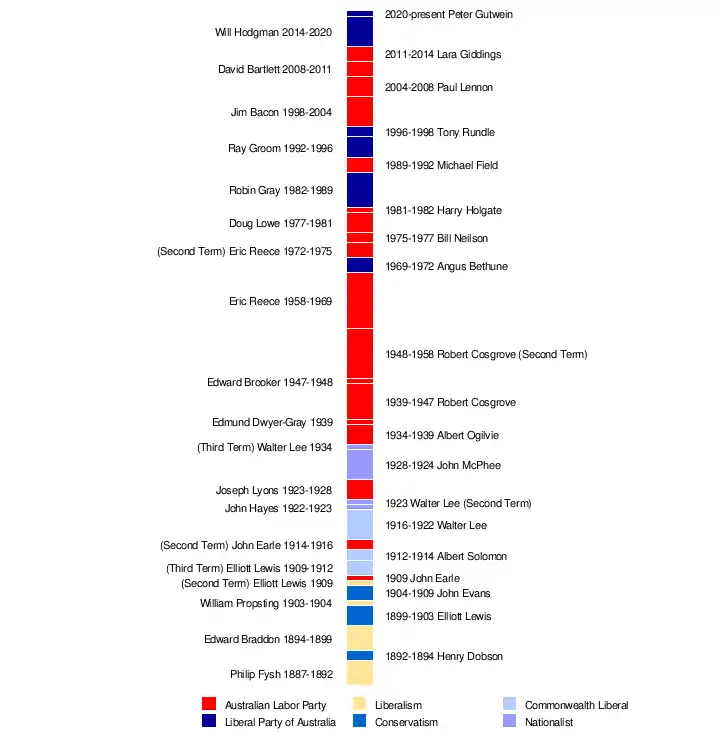 The Premier of Tasmania is the head of the executive government in the Australian state of Tasmania. By convention, the leader of the party or political grouping which has majority support in the House of Assembly is invited by the Governor of Tasmania to be Premier and principal adviser.[1]