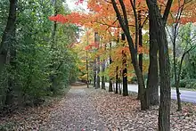 The first paved road was built in the park in 1924,[4] and today 13 miles (21 km) of roads run through the park.[2] Pennsylvania Route 832 is the main road into the park, and is subsequently known as Peninsula Drive.[18] Presque Isle has been referred to as "Peninsula State Park".[19] The Perry Monument in the park was constructed in 1926 near Misery Bay and the burials in Graveyard Pond.[2]