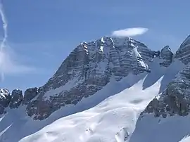 Mount Prestreljenik (Italian: Monte Forato) is a 2,499-meter (8,199 ft) mountain in the western range of the Julian Alps, in the Tolmin region of Slovenia on the Italian–Slovenian border. It is the second-highest peak in the central part of the Kanin group. Prestreljenik is known for the Window (Okno), an erosion-arch feature located on its western ridge. This aperture is the source of both of the mountain's local endonyms; Prestreljenik means 'shot-through' in Slovene, and Forato is Italian for 'pierced'