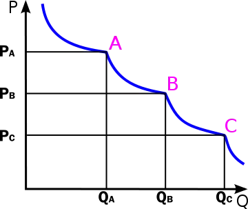 The diagram shows price points at the points labeled A, B, and C. When a vendor increases a price beyond a price point (say to a price slightly above price point B), sales volume decreases by an amount more than proportional to the price increase. This decrease in quantity-demanded more than offsets the additional revenue from the increased unit-price. As a result, total revenue (price multiplied by quantity-demanded) decreases when a firm raises its price beyond a price point. Technically, the price elasticity of demand is low (inelastic) at a price lower than the price point (steep section of the demand curve), and high (elastic) at a price higher than a price point (gently sloping part of the demand curve). Firms commonly set prices at existing price-points as a marketing strategy.