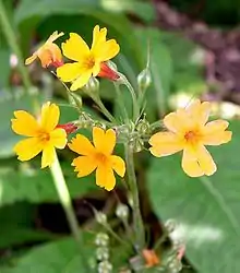 Primula /ˈprɪmjʊlə/[1] is a genus of mainly herbaceous[2] flowering plants in the family Primulaceae. They include the familiar wildflower of banks and verges, the primrose (P. vulgaris). Other common species are P. auricula (auricula), P. veris (cowslip) and P. elatior (oxlip). These species and many others are valued for their ornamental flowers. They have been extensively cultivated and hybridised - in the case of the primrose, for many hundreds of years. Primula are native to the temperate northern hemisphere, south into tropical mountains in Ethiopia, Indonesia and New Guinea, and in temperate southern South America. Almost half of the known species are from the Himalayas.[2]