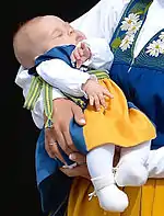 Her name and titles were revealed when her maternal grandfather, King Carl XVI Gustaf, met with the cabinet on 26 February 2014.[9][10] Her first name was chosen by her parents as one that they both liked very much after considering a very large number of other names.[11] It has been used previously by four Swedish queens, but then only in full as Eleonora. Her middle names honour her great-grandaunt Princess Lilian, Duchess of Halland, and her paternal grandmother.[12] Leonore was registered with the surname Bernadotte in the Swedish registry.[1] A Te Deum thanksgiving service was held in the Royal Chapel at Stockholm Palace on 2 March 2014 to celebrate her birth.[13][14]