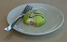 Princess cake (Swedish: prinsesstårta) is a traditional Swedish layer cake or torte consisting of alternating layers of airy sponge cake, pastry cream, and a thick-domed layer of whipped cream. The cake is covered by a layer of marzipan, giving it a smooth rounded top. The marzipan overlay is usually green, sprinkled with powdered sugar, and often decorated with a pink marzipan rose.[1]