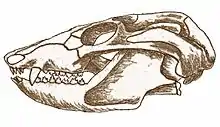 The skull of Probainognathus is, on average, around 7 cm in length, and is missing the parietal foramen.[1] The skull is broad in proportion to its length, the face is short and narrow, but its zygomatic region is relatively large, seemingly for jaw muscle attachment.[1] The skull also possesses a double occipital condyle, which is a typical mammalian feature.[10] In comparison to close relatives, such as Probelesodon, the braincase of Probainognathus is more broad in the parietal region, and the oticoccipital region of the skull is deeper. Likewise, the parietals have more depth, the occipital crest is higher, and the orbits are proportionately larger relative to the rest of its head. The sagittal crest is also lengthened posteriorly, and splits into the occipital crests. This leads to a straighter posterior margin, and a more concave occiput in Probainognathus.[1]