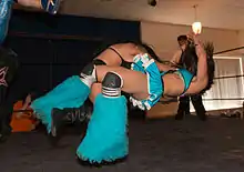 This arm drag sees the wrestler being held in a wheelbarrow hold by the opponent, and then going for an over the shoulder arm drag as they free their legs off of the opponent's waist. It was used by AJ Lee as a Transition Move.