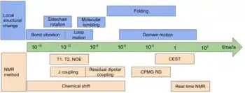 Protein Nuclear Magnetic Resonance (NMR) is able to collect protein structural data by inducing a magnet field through samples of concentrated protein. In NMR, depending on the chemical environment, certain nuclei will absorb specific radio-frequencies.[53][54] Because protein structural changes operate on a time scale from ns to ms, NMR is especially equipped to study intermediate structures in timescales of ps to s.[55] Some of the main techniques for studying proteins structure and non-folding protein structural changes include COSY, TOCSY, HSQC, Time relaxation (T1 & T2), and NOE.[53] NOE is especially useful because magnetization transfers can be observed between spatially proximal hydrogens are observed.[53] Different NMR experiments have varying degrees of timescale sensitivity that are appropriate for different Protein Structural changes. NOE can pick up bond vibrations or side chain rotations, however, NOE is too sensitive to pick up Protein folding because it occurs at larger timescale.[55]