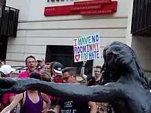 The protesters sometimes attempted to enter the venue or engage in activities outside the venue. Interactions with supporters of the candidate may occur before, during or after the event.[24] At times, protesters attempted to rush the stage at Trump's rallies.[25] At times, anti-Trump protesters have turned violent and attacked Trump supporters and vice versa;[26] this violence has received bipartisan condemnation.[27] MoveOn.org, The People for Bernie Sanders, the Muslim Students' Association, Assata's Daughters, the Black Student Union, Fearless Undocumented Alliance and Black Lives Matter were among the organizations who sponsored or promoted the protests at the March 11 Chicago Trump rally.[17][28][29][30]