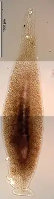 Members of this family are elongate, flat, and long of 1 to several millimetres.[3][5][6][7] The reproductive system includes many testes, located in the anterior region of the body between the ceca, and a single posterior ovary. The male copulatory organ usually has spines. The posterior attachment organ or haptor, which attaches the worm to the host, is asymmetrical and has three pairs of small hooks.