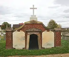 A classical marble facade with baroque scrolls decorate the partially subterranean vault. Double wrought iron doors have the words "PUBLIC VAULT" displayed by means of vent holes.[6] The vault is constructed of Aquia Creek sandstone, which was also used to construct many important early structures in Washington, including the White House, the Capitol, and the Latrobe cenotaphs in the cemetery.[7] The vault does not have any niches or shelves to hold coffins, rather the coffins were placed on the floor and stacked if necessary.[8]