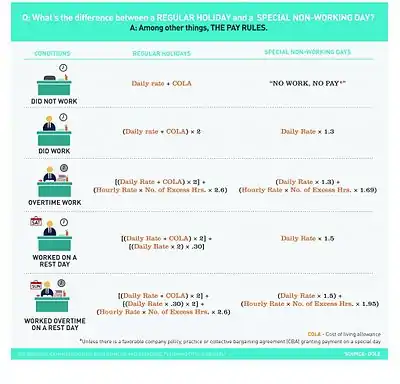 Regular holiday and special non-working day have different pay rules. On a regular holiday, if the employee did not work, the employee is entitled 100% of his daily wage. However, special non-working day usually follows a 'No Work, No Pay' principle. Therefore, the employee is not entitled to any compensation if he did not work that day. If the employee works on the special non-working day, the employee shall be entitled to an additional compensation of 30% of his regular daily wage.[57]