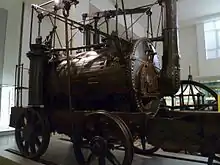 In 1810 the Durham Coalfield was disrupted by a major strike over the Bond system.[3][4] During this time Christopher Blackett, owner of the Wylam Colliery, took advantage of the pit's idleness to experiment with the idea of a locomotive-hauled tramway worked purely by adhesion, rather than the Blenkinsop rack system used on the Middleton.[5] These began with a simple hand-cranked wagon, converted from a coal wagon chassis with the addition of a central drive shaft and geared drives to the axles.[6]