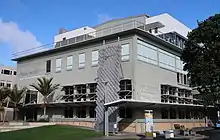 By the 1930s, the museum and library were considered hopelessly overcrowded, and a new site was sought, but it was many years before approval was granted for a combined library, museum, and war memorial building on a site bounded by King, Brougham, and Ariki streets.[4] The building was designed by Taylor and Collins, and the contractors were Fairbrother, Snowden and Wheeler Ltd.[9] Planning began in 1954, and the four-story building opened on 14 July 1960.[9] Its top floor was the War Memorial Hall, the next floor the Taranaki Museum, and the mezzanine and ground floors the library.[4] One wing, designated for art display, was occupied by the North Taranaki Society for Arts, until they were forced out by a need for more museum display space.[7]