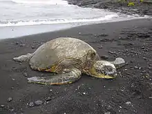 The threatened green turtle or honu (Chelonia mydas) feeds on marine plants in shallow waters along the coastline such as Punaluʻu. Red seaweed, a favorite food of the green turtle flourishes on the coral-encrusted rocks in the shallow waters of the bay and the turtles are found basking on the black sand beach despite the presence of beachgoers. Researchers with the National Marine Fisheries have been studying the green turtle since 1982 along with groups of students. Visitors must remain 15 ft (4.6 m) from the turtles at all times.