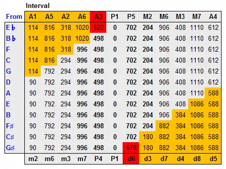(cents)A♭ diminished fifth 588.27 −11.73 E♭ minor second 90.22 −9.78 B♭ minor sixth 792.18 −7.82 F minor third 294.13 −5.87 C minor seventh 996.09 −3.91 G perfect fourth 498.04 −1.96 D unison 0.00 0.00 A perfect fifth 701.96 1.96 E major second 203.91 3.91 B major sixth 905.87 5.87 F♯ major third 407.82 7.82 C♯ major seventh 1109.78 9.78 G♯ augmented fourth 611.73 11.73