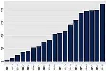 Currently, there are thousands of Q-Chem licenses in use, and Q-Chem's user base is expanding, as illustrated by citation records for releases 2.0, 3.0, and 4.0, which reached 400 per year in 2016 (see Figure 2).[7]