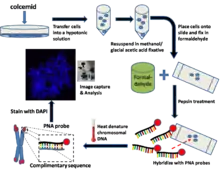 Quantitative Fluorescent in situ hybridization (Q-FISH) is a cytogenetic technique based on the traditional FISH methodology. In Q-FISH, the technique uses labelled (Cy3 or FITC) synthetic DNA mimics called peptide nucleic acid (PNA) oligonucleotides to quantify target sequences in chromosomal DNA using fluorescent microscopy and analysis software. Q-FISH is most commonly used to study telomere length, which in vertebrates are repetitive hexameric sequences (TTAGGG) located at the distal end of chromosomes. Telomeres are necessary at chromosome ends to prevent DNA-damage responses as well as genome instability. To this day, the Q-FISH method continues to be utilized in the field of telomere research.