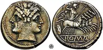 The quadrigatus was a medium-sized silver coin produced by the Roman Republic during the 3rd century BC.[1] The obverse featured a young janiform bust and the reverse featured Victory driving a quadriga (four-horse chariot), giving the coin its Roman name, with the inscription "ROMA" below.