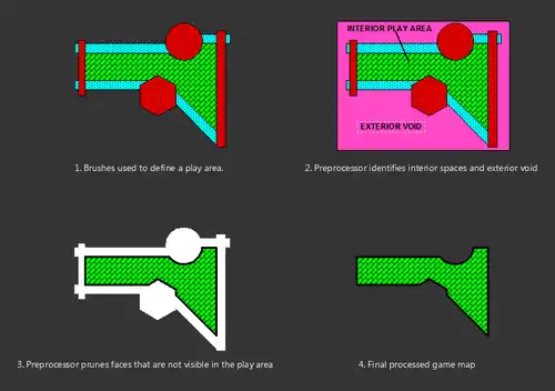 A processed map file can have a much lower polygon count than the original unprocessed map, often by 50–80%. On the 50–75 MHz PCs of the time, it was common for this pruning step to take many hours to complete on a map, often running overnight if the map design was extremely complex.