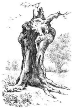 When Mary died on 17 November 1558, Elizabeth succeeded to the throne. It is said that the messenger from London bearing this news imparted it to Elizabeth while she was sitting beneath this tree, reading the bible or eating an apple (or perhaps both).[3] Elizabeth's famous response was supposedly "this is the Lord's doing, and it is marvelous in our eyes".[3] Hatfield Palace was later swapped by James I for Theobalds House, owned by Robert Cecil, 1st Earl of Salisbury, one of Elizabeth's advisers. Cecil demolished much of the palace and built a new house nearby.[2] The oak was located near to one of the avenues leading to the new house.[4]