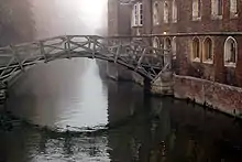 The Mathematical Bridge (officially named the Wooden Bridge) crosses the River Cam and connects the older half of the college (affectionately referred to by students as the "dark side") with the newer western half (the "light side", officially known as "The Island"). It is one of the most photographed scenes in Cambridge; the typical photo being taken from the nearby Silver Street bridge.