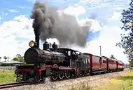 The Queensland Pioneer Steam Railway is located near Ipswich, Queensland, Australia and running through the former West Moreton pioneering coal fields. First opened in 1881 by colliery proprietor and politician Lewis Thomas (1832-1913) as a tramway to his coal mines.[1] The right-of way later taken over extended to take in over 20 mines before reaching to its present termini at Swanbank Loop by Queensland Railways where it served the Swanbank Power Stations. The branch remains the oldest continuously operating branchline in Queensland. Since 1978 Queensland Pioneer Steam Railway has operated passenger trains on this branch line using heritage rollingstock.