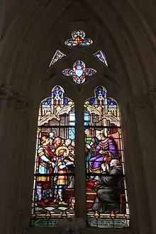 The next window, a gift from Monseigneur Jacquelot du Boisrouvray, illustrates events in the life of the French king, Saint Louis. It comprises 16 medallions which depict the main events in the king's life. These include his education by Blanche de Castille, his imprisonment and his participation in the crusades.[2][4][6] The window is by Hirsch and A.Mongin.