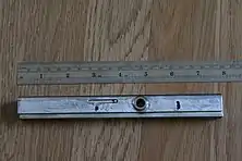 Top view of a Challenge Hi-Speed Quoin, model H M47, by The Challenge Mchry Co, Grand Haven, Michigan, U.S.A. The hole to the right of center is for a quoin key. The quoin is about 190 mm (7.5 in) long, and 18 mm (0.7 in) tall. The width expands by about 10 points, from 17 mm (0.68 in) to 21 mm (0.82 in) as the quoin key is turned clockwise.