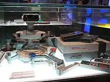 The Family Computer Robot, a recent niche entry in the Famicom's aftermarket accessory lineup in Japan on July 26, 1985, is a mechanized toy robot with working arms and crude eyesight, resembling "a cross between E.T. and R2-D2".[5]:213–214 It was designed and patented by veteran Nintendo designer Gunpei Yokoi.[9][10] Used as a functional companion for playing select video games within a custom playset, it was recolored for the NES and was thrust forth as essential to the NES's new identity as a futuristic, robot-powered experience. The Milwaukee Journal said, "The key to the NES is the interactive robot ... You no longer have to fight only the aliens on the screen; you have a robot to contend with as well."[11] Computer Entertainer called it "the world's only interactive robot", as no other video game system or home computer package ever had one, greatly distinguishing the NES to retailers and consumers alike.[3]