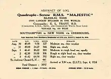 Majestic was placed on the North Atlantic run from Southampton to New York in tandem with Olympic and Homeric. She sailed on her maiden voyage from Southampton on Wednesday, 11 May 1922 at 11.30 am under the command of Sir Bertram Hayes.[12][13] She reached New York in 5 days, 14 hours and 45 minutes at an average speed of 22.69 knots (42.02 km/h; 26.11 mph). When she docked in New York, she was so large that 41 feet (12 m) of her stern projected into the Hudson River not flanked by the pier, at the time no pier in New York was long enough to take her.[14] On the eastern leg of her maiden voyage, Majestic managed to travel from New York (Ambrose Channel Lightship) to Eddystone Light, a distance of 3,139 nautical miles (5,813 km; 3,612 mi) in 5 days, 9 hours and 42 minutes at an average speed of 24.2 knots (44.8 km/h; 27.8 mph).[15]