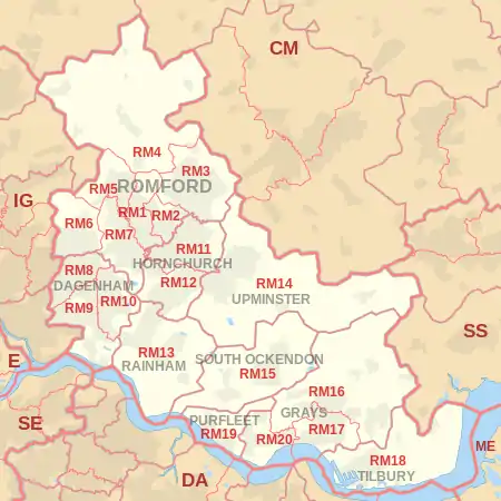 The RM postcode area, also known as the Romford postcode area,[2] is a group of twenty postcode districts in England, within nine post towns. These cover parts of east London, most of the London Borough of Havering and south-west Essex. Inward mail for the area is sorted, along with mail for the E and IG postcode areas, at the Romford Mail Centre.