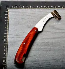 Race knife also known as a timber scribe (scorer, tree marker) is a knife with a U-shaped end sometimes called a scoop knife for cutting marks in wood by lumbermen, carpenters, coopers, surveyors, and others.[1][2] The reasons for making marks varies and includes keeping count (tally marks), identifying parts (carpenter's marks), numbering, and tracing patterns around a template as a part of marking out. The gouges left by the timber scribe are more durable than pencil or chalk marks.