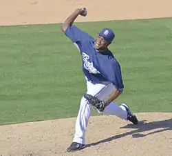 Liz is known for his remarkably long arms; when he stands with his arms at his sides, his fingers reach below his knees.[14] Liz uses a straight overhand pitching motion and throws his fastball consistently in the mid- to upper-90s[15] and has been clocked at 99 mph.[16] His other pitches include an overhand curveball, a sinker, a slider, and two variations of a changeup.[17] Early in his professional career, Liz received attention because of a clicking sound which is sometimes loud enough to be heard in the stands and occurs whenever he throws a pitch. Some have thought it to be his thumb clicking against his index finger.[18] Orioles head athletic trainer Richie Bancells discovered that Liz's scapula caused the clicking; although rare, this condition does not hurt his pitching career. To treat this condition, Liz has been doing an exercise program to strengthen the muscles around his collarbone.[19]