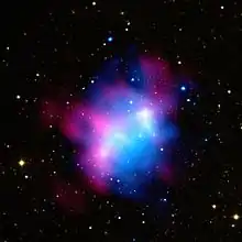 Radio relics resemble haloes but are found at the edge of clusters. They are likely to result from synchrotron radiation originating from electrons accelerated by shock waves, moving in the intracluster magnetic field of around 0.1 - 3 μG.[4]