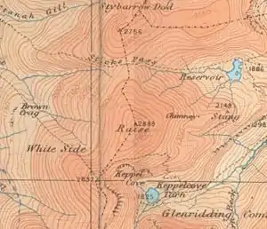 To the north of Raise the pedestrian route of Sticks Pass crosses the ridge at a height of 2,445 ft (745 m), this being the highest pass in the District crossed by a regular bridleway.[1] Now of use purely to hillwalkers, it once provided the only connection between the communities on either side of the Helvellyns. The name is believed to be taken from the guideposts originally used to mark the route.[2] The becks flowing from either side of the pass summit are both officially named Sticks Gill, the '(East)' and '(West)' having been added by Alfred Wainwright in his Pictorial Guide to the Lakeland Fells and utilised by later guidebook writers. To the north, beyond the pass, the ground rises again to Stybarrow Dodd and all here is grass.