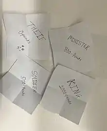 The game begins with making 4 chits namely Raja (1000 points), Mantri (800 points), Chor(0 points) and Sipahi (500 points). Each chit is folded-shuffled and distributed among 4 players with each player picking one chit. Players can open their respective chit to find out their character(which shall not be revealed to anybody). The player with the chit containing Raja exclaims “Mera Mantri Kon” which translates to ‘Who is my Minister?’ in English, The Mantri then has to identify the ‘Chor’ from the other 2 remaining players. If the Mantri, guesses correctly then the points are retained or else he/she surrenders them to the Chor. Several rounds of this game are played before counting the points. The player with the highest score wins the game.[2]