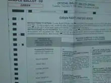 By September 18, 2008, Nader and Gonzalez were on the ballot in 45 states; in four of the five remaining states, with write-in status. Oklahoma did not allow write-in candidates.[32] For ballot access in most states, the Nader campaign had to circulate nominating petitions, with varying numbers of signatures and deadlines, to get on the ballot. In some states, the requirements for ballot access are lower for new parties than for independents, so Nader attempted to qualify as the candidate of the Independent Party (composed of Nader supporters). Nader qualified for the 2008 New Mexico ballot using the new party procedure, rather than qualifying as an independent, because the number of signatures for a new party is only one-sixth as many signatures.[33] The campaign also turned in petitions in Hawaii, which requires 663 signatures. The Independent Party turned in approximately 2,100.[34]