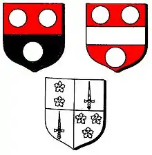 - c) Two cinquefoils pierced; quartering, 2 and 3, a sword in pale, point towards chief; 4, three cinquefoils[1]