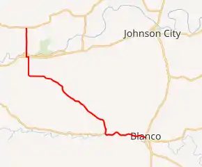 RM 1623 begins in eastern Gillespie County at an intersection with RM 2721.[2] It travels to the south into Stonewall, where it crosses Ranch Road 1, and has a one-block eastward concurrency with US 290 before continuing southward. It then turns to the southeast and crosses into Blanco County.[3] The route intersects RM 1888 before turning to the east and running along the north bank of the Blanco River into Blanco.[4] The RM 1623 designation ends at US 281 in central Blanco; the roadway continues as Loop 163.[1]