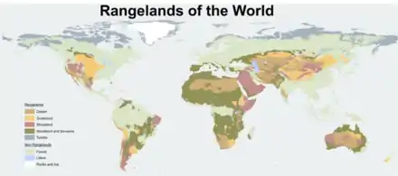 Rangelands produce a wide variety of goods and services desired by society, including livestock forage (Grazing), wildlife habitat, water, mineral resources, wood products, wildland recreation, open space and natural beauty. The geographic extent and many important resources of rangelands make their proper use and management vitally important to people everywhere.[23]